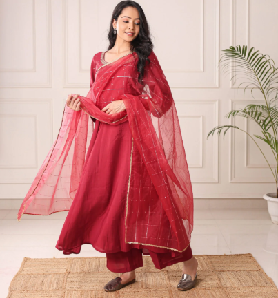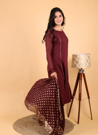 2. Maroon Crepe Kurta Set with Dupatta — Emberveil Ensemble