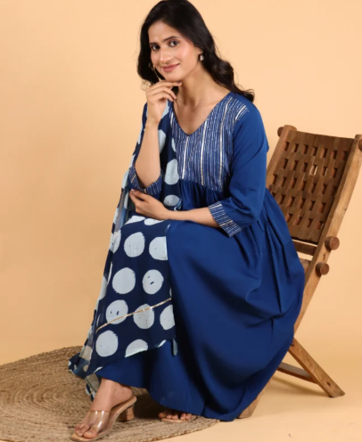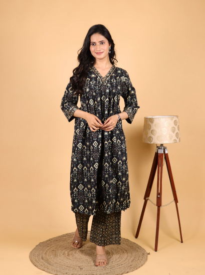 This one is a charming pick among diwali dresses for women who lean toward understated elegance. The cotton base ensures comfort, and the black floral print introduces a sophisticated contrast perfect for the evening festivities. Pair it with golden jhumkas and a matching dupatta to elevate it from casual to festive. This is an ideal traditional dress for Diwali when you want effortless grace.